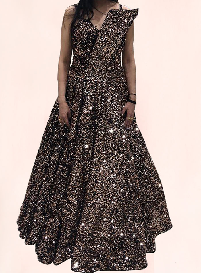 This gown features a V neckline, curved bust panel, a deep V cut at the back and is sleeveless. Material: Sequins; Composition: 100% Polyester with Polyknit Lining. Style Note: Enwrap yourself in the majestic silhouette of this gown, and turn yourself into a style Goddess! Wear it with heels and a clutch for a movie premiere - says Shimoli Kapasi our inhouse stylistWe are committed to satisfy our customer and hence you can come to us any time for all of your queries