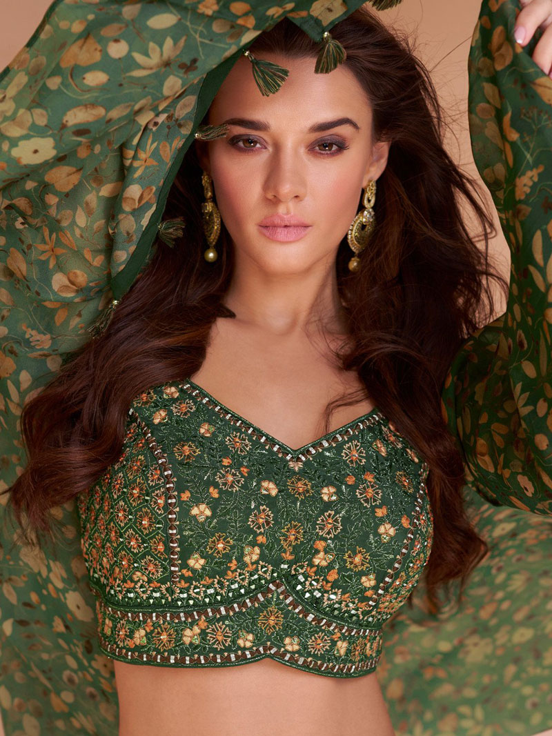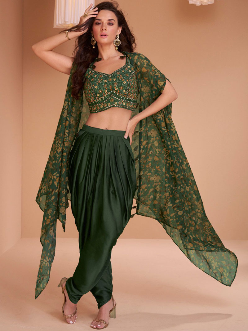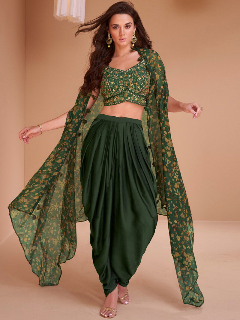 | Exclusive Partywear Stitched Designer Indo-Western Set. Green Silk Resham Zari Thread Embroidered Top upto 42" Bust, Grey Silk Dhoti Style Tulip Pants, Multicoloured Floral Printed Georgette Shrug with Tassels. Dry… |