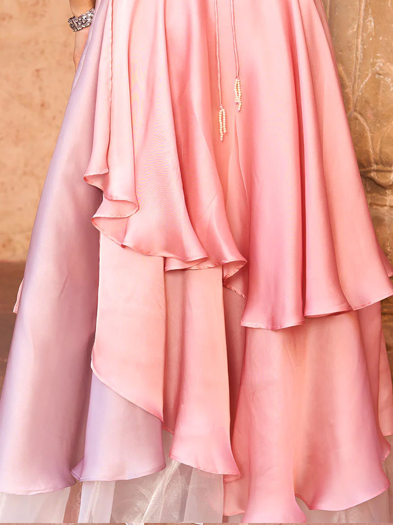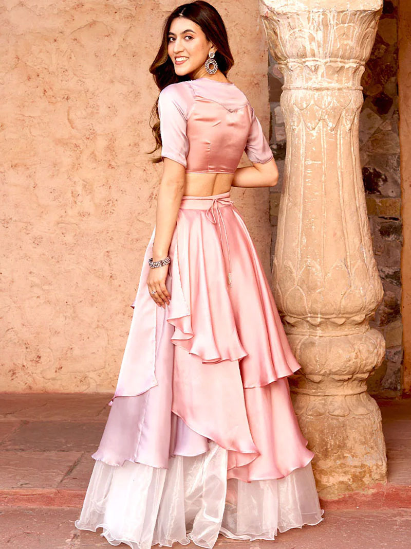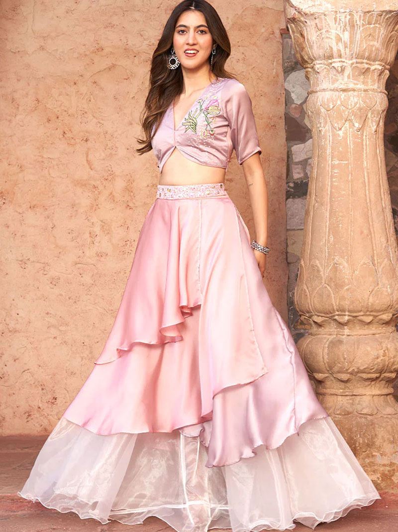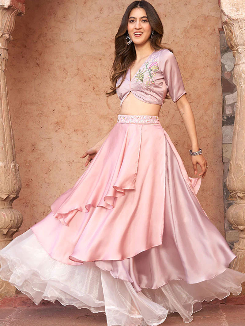 Embrace feminine elegance with our Soft Pink Mauve Top layered with a gracefully flowing skirt. This enchanting ensemble effortlessly combines sophistication and charm, making it the perfect choice for a stylish and memorable look. Elevate your fashion statement with this delightful pairing that radiates grace and allure. Color - Pink Material - Silk Sleeve Type - Half Sleeves Occasion - Festive Neckline - V-Neck Fit - Regular Pattern - Solid/Plain Apparel Closure Type - Zip Rise - High Waist |