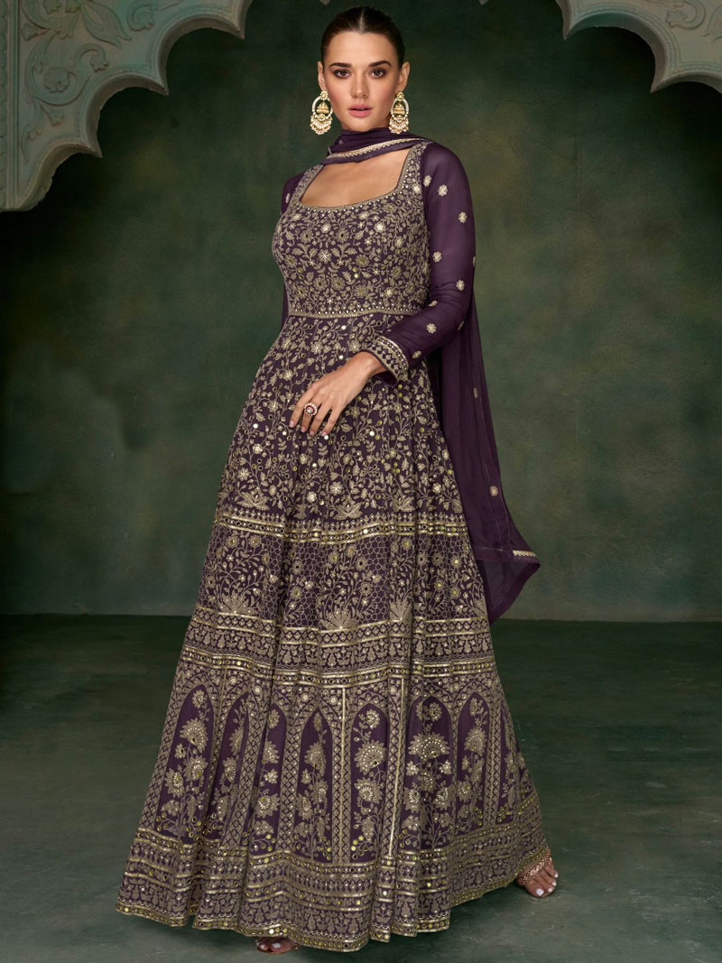 | Presenting Party Wear Designer Collection Real Georgette Gown with Embroidery. Beautiful Traditional Designer Gowns for your Charm and Elegance. Curated with Real Georgette, pretty and elegant designs, wear on any formal occasion be it party or wedding. Dry Clean Only |