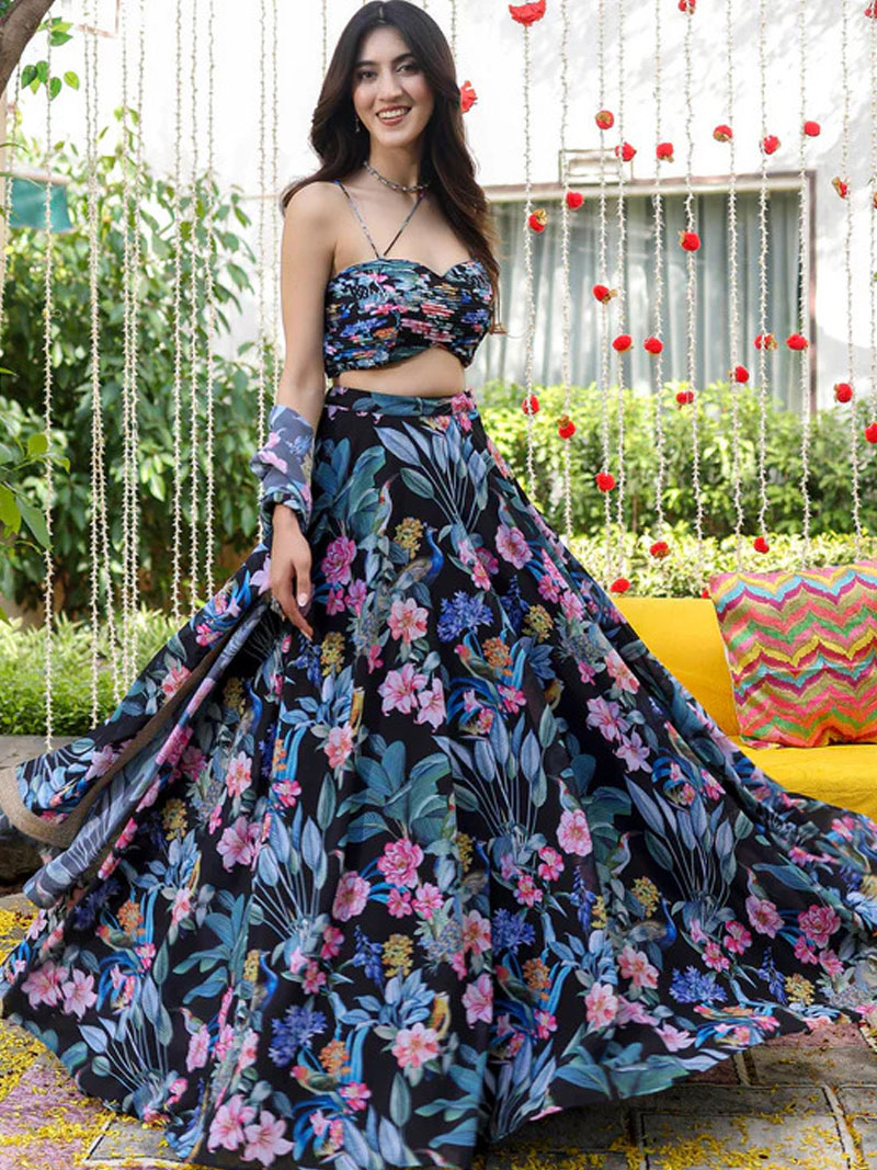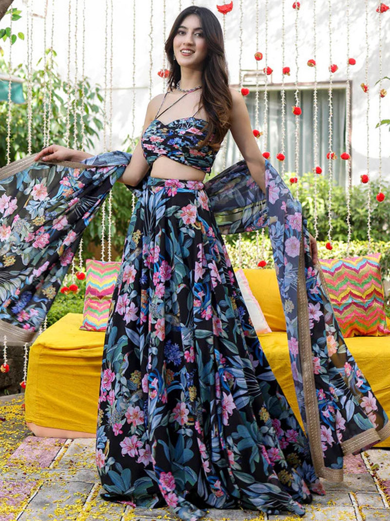 Elegance in Every Stripe: Step into Festive Glamour with our Black Printed Lehenga Set. The noodle straps, sweetheart neckline, regular fit, captivating print, and convenient zipper create a seamless and stylish ensemble. Elevate your celebration with high-rise sophistication. Color - Black Material - Georgette Sleeve Type - Sleeveless Occasion - Festive Neckline - Sweetheart Fit - Regular Pattern - Printed Apparel Closure Type - Zip Rise - High Waist Work - N/A |