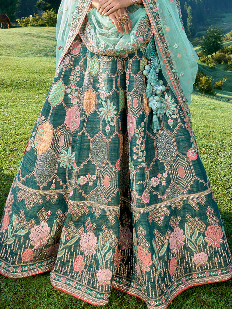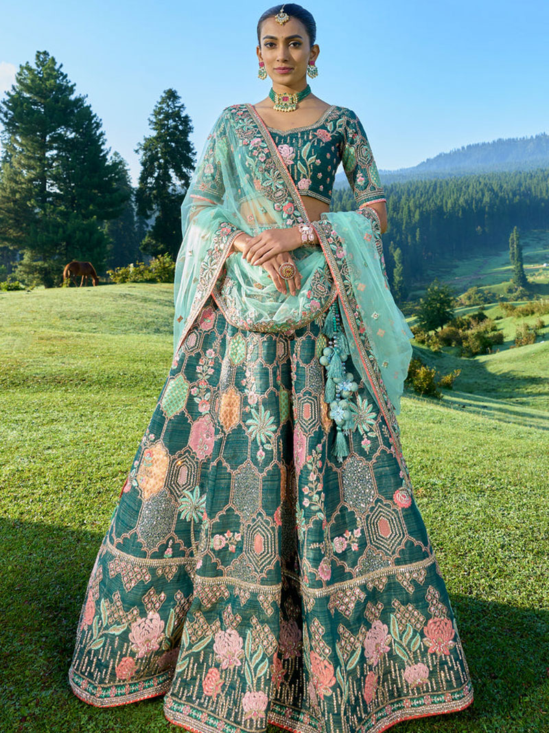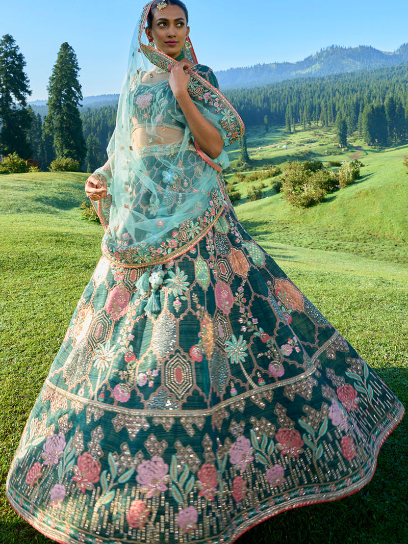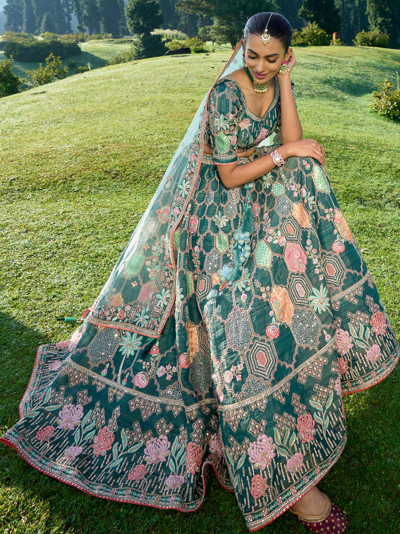 | Get the simplicity and grace with this green silk and viscose lehenga choli. It is uniquely crafted with . Comes with matching choli and dupatta. |