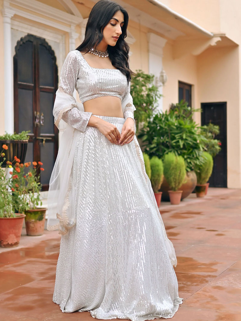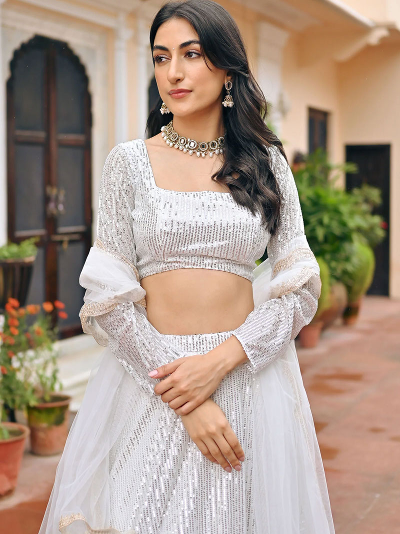 White sequin lehenga set. Tailored to sartorial perfection from premium quality fabric, it assures a soft and soothing touch against the skin. The exquisite silhouette adds to its appeal. Color - White Material - Georgette Sleeve Type - Full Sleeves Occasion - Festive Neckline - Square Neck Fit - Normal Pattern - Embellished/Sequined Apparel Closure Type - Hook And Eye Rise - High Waist |