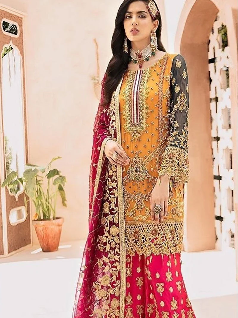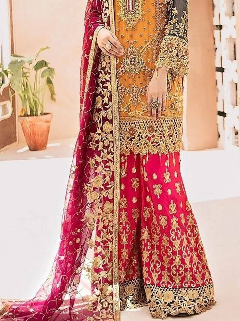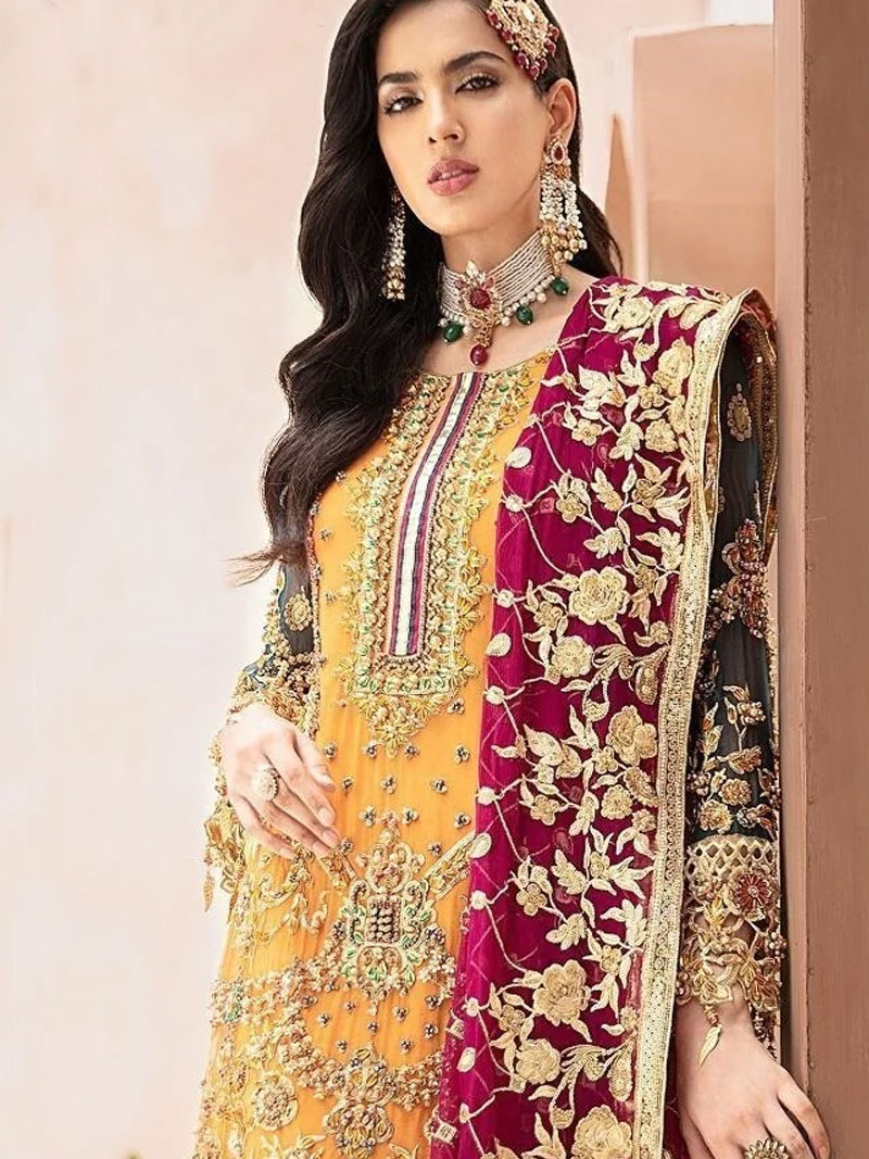 Fabric: TOP – PURE GEORGETTE WITH HEAVY EMBROIDERY WORK & SEQUINS WORK WITH DIAMOND STONE WORK INNER – SANTOON BOTTOM – PURE GEORGETTE WITH HEAVY EMBROIDERY WORK & PEARL MOTI WORK DUPATTA – NET HEAVY EMBROIDERY WORK WITH PEARLS MOTI WORK, LACE & TASSELS Occasion: Wedding, Festive & Party Wear Type : Semi-Stitched Free Size (The dress material is unstitched, as per your size you can stitch the dress.) |