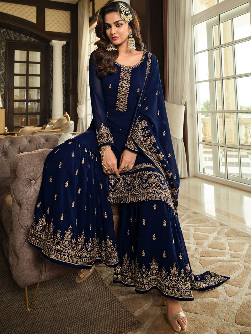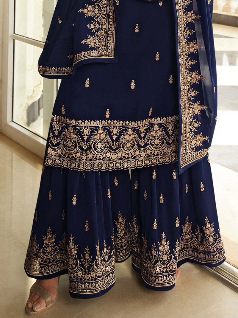 Work:- Embroidery & Sequins Wash care:- Dry Clean only Type:- Un-Stitched Size Top:- 2.5 mtr Size Dupatta:-2.25 mtr Size Bottom:- Waist-36-44 inch Packet Content:- 1N Un-Stitched Kurta, 1N Stitched Bottom,1N Dupatta Length:- Bottom-43 inch Fit:- This material can be stitched to fit bust size upto 106 cm and waist size upto 104 cm Fabric Dupatta:- Georgette Fabric Bottom:- Georgette Fabric:- Georgette Dupatta Color:- Dark Blue |
