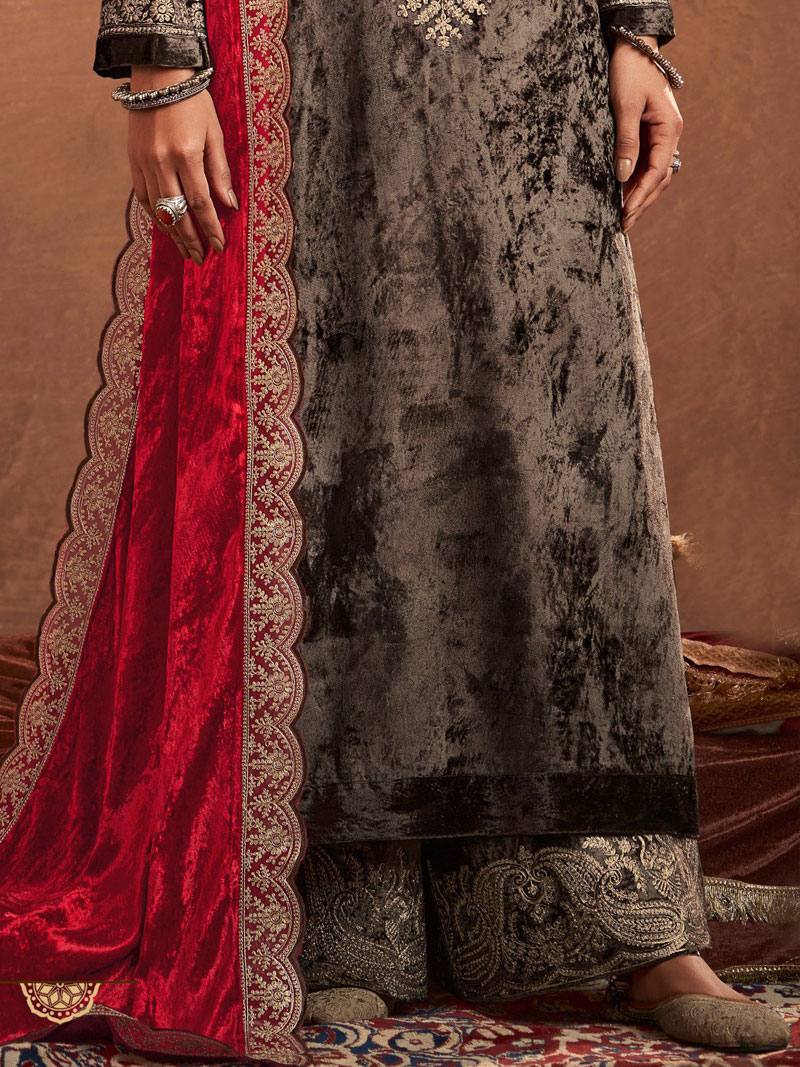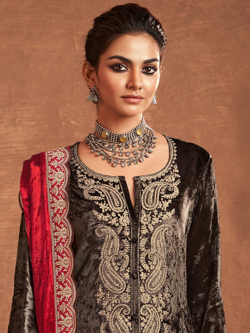 | Pure velvet silk designer winter suit Has Embroidered on neck and Plazo With beautiful Patterns in Dupatta. Dry Clean Only |