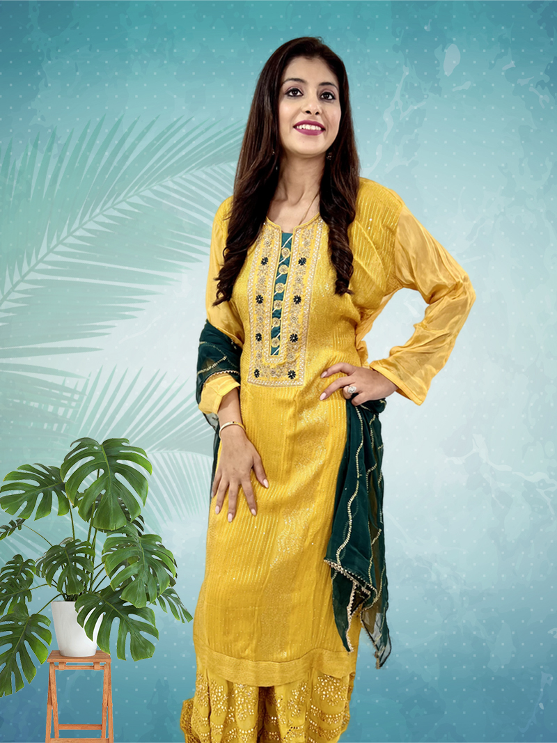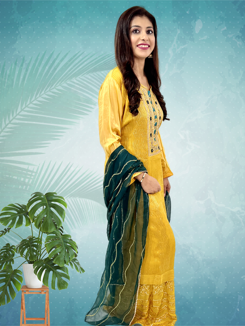 Give your traditional look a trendy touch with this gorgeous designer embroidered Anarkali Suit with heavy sharara . Comprising the stunning color and design, this set in Georgette made which makes it the perfect outfit for every season.We are committed to satisfy our customer and hence you can come to us any time for all of your queries