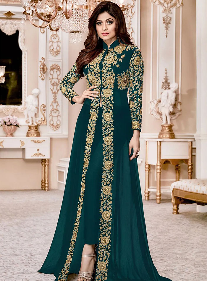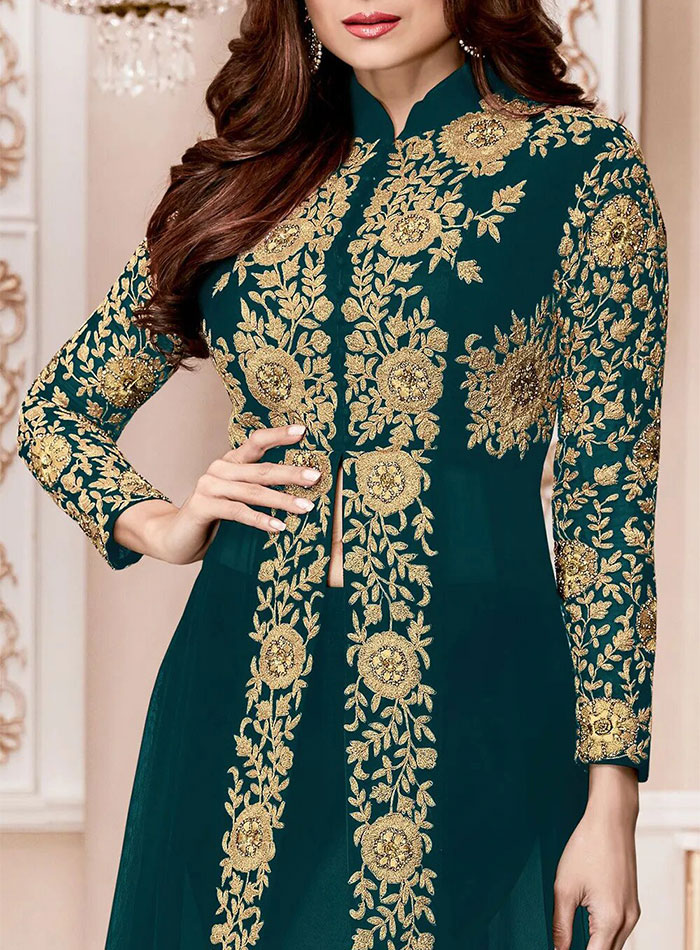 Embroidered Georgette Suit in Teal Blue. "Semi- Stitched Faux Georgette Abaya Style Kameez in Teal Blue.This Chinese Collar Neck and Full Sleeve attire with Poly Shantoon Lining is Prettified with Zari and Stone Work. Available with a Poly Shantoon Straight Pant and a Faux Chiffon Dupatta in Teal Blue.The Kameez and Bottom Lengths are 55 and 42 inches respectively.We are committed to satisfy our customer and hence you can come to us any time for all of your queries