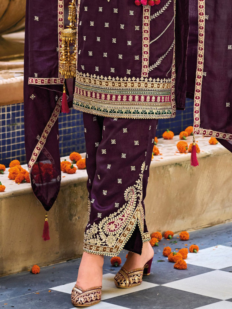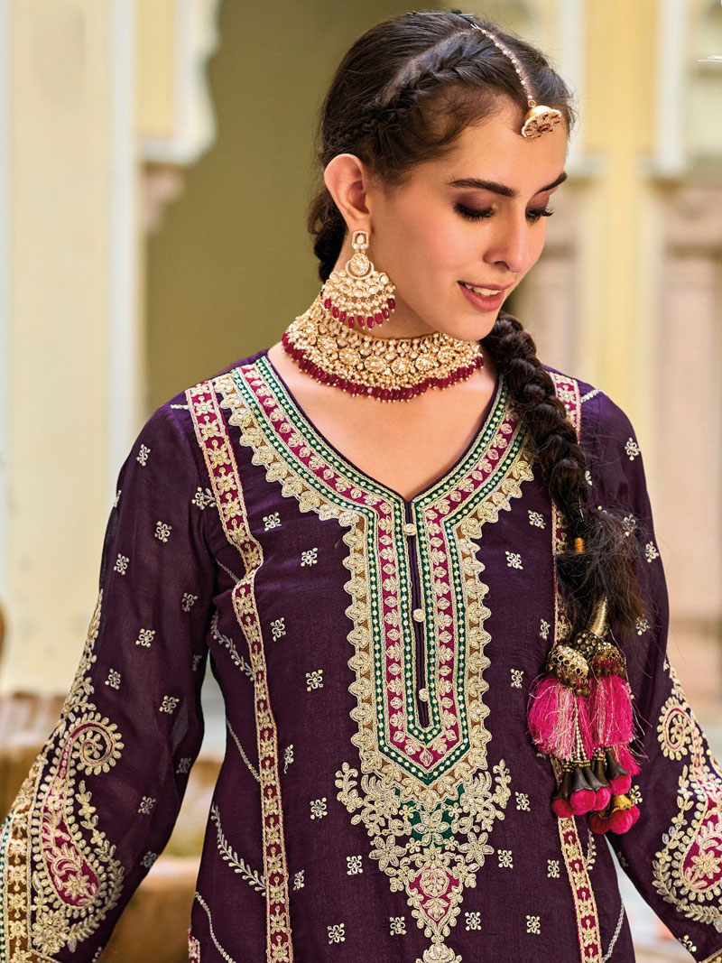 | Exclusive Partywear Stitched Designer Embroidery, Sequins, Zari, Gotta Patti & Tassels V-Neck Regular fit Palazzo Suit Set. Dry Clean Only |