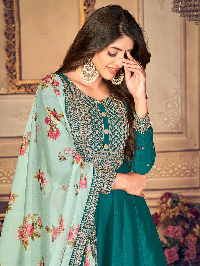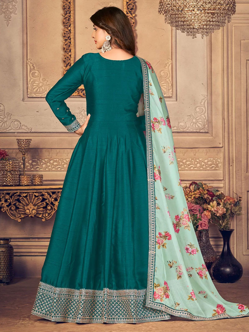| Create a smoldering impact by this green silk salwar suit. The lovely embroidered work a substantial feature of this attire. Comes with matching bottom and dupatta. (Slight variation in color, fabric & work is possible. Model images are only representative.) |