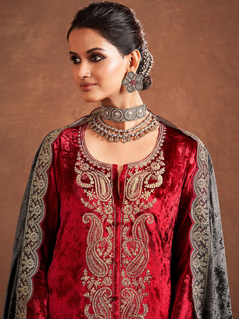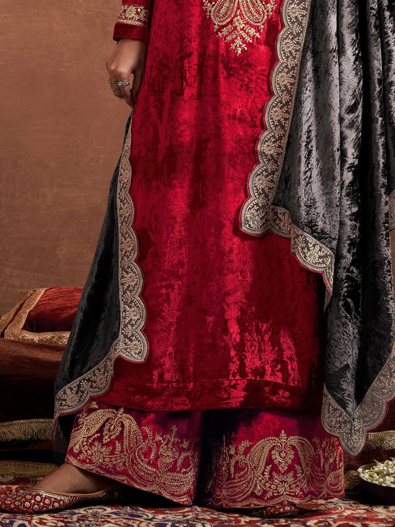 | Pure velvet silk designer winter suit Has Embroidered on neck and Plazo With beautiful Patterns in Dupatta Dry Clean Only |