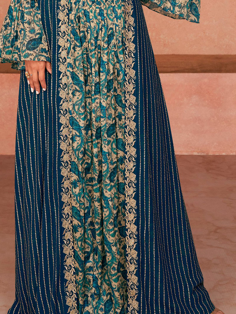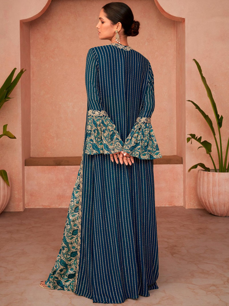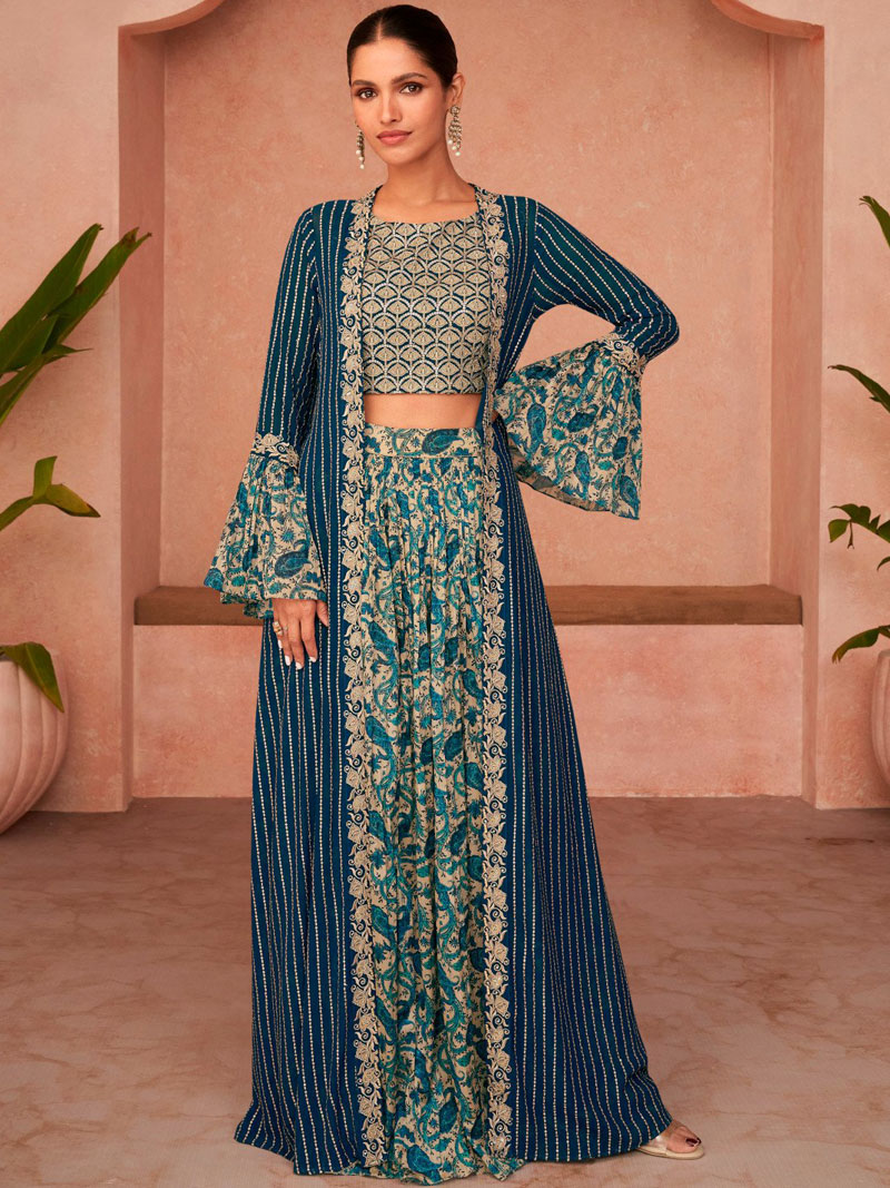 | This georgette indo western is the fun attire of the moment. Get it on and style it with a handbag and earrings for the perfect day look. Its and cute - the essentials for your wardrobe.Dry Clean Only |