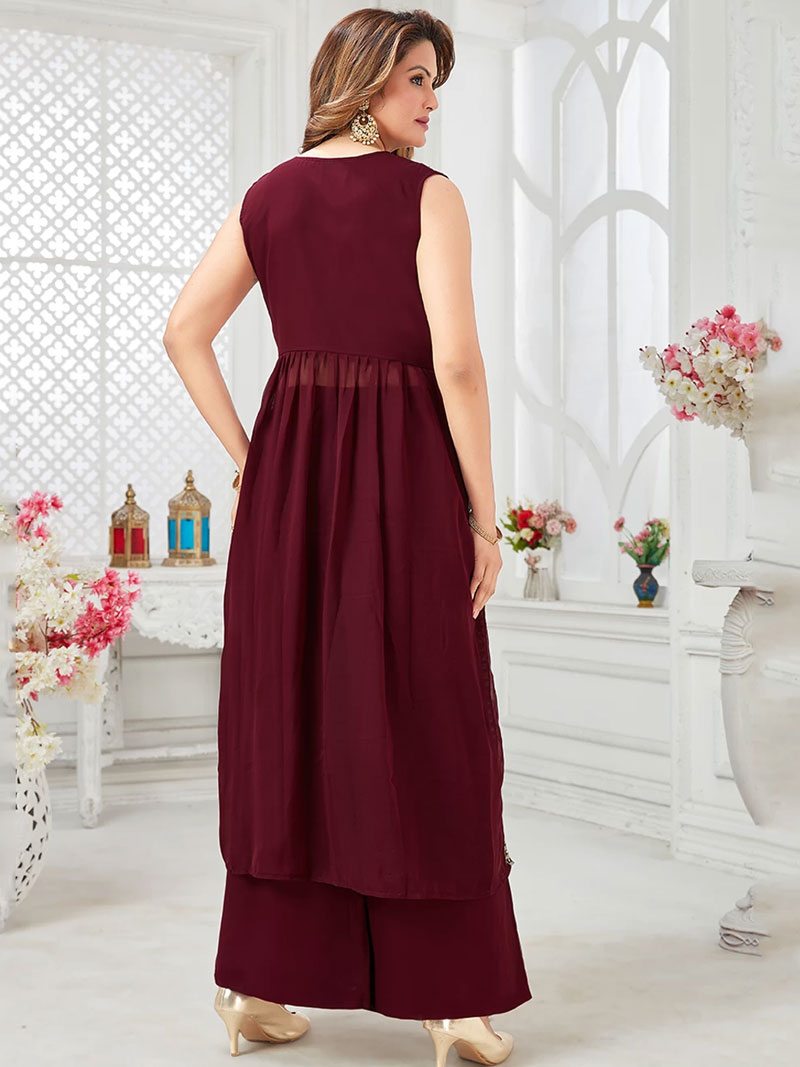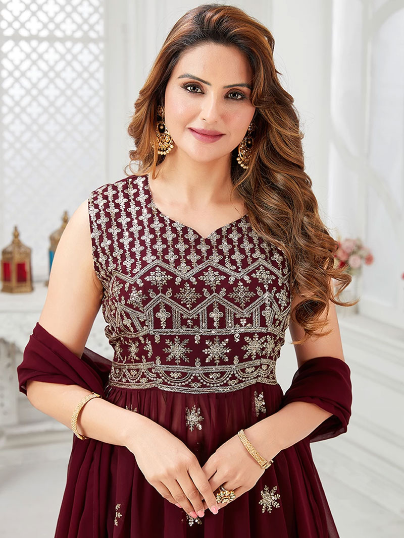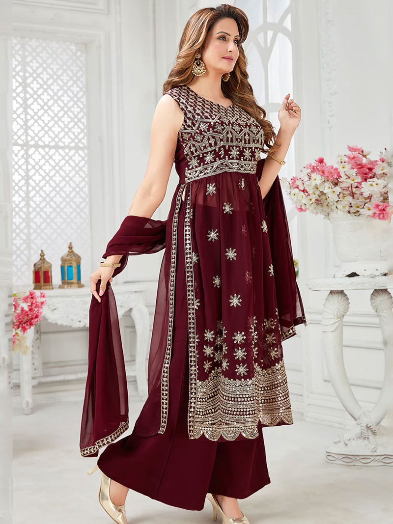 | Be the sunshine of everyone’s eyes dressed in this gorgeous burgundy faux georgette designer salwar kameez. The embroidered, resham and sequins work looks chic and great for any affair. Comes with matching bottom and dupatta. (Slight variation in color, fabric & work is possible. Model images are only representative.) |